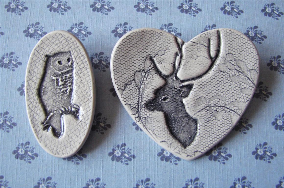 little forest creatures - stamped brooches - new mottled black and off-white glaze colours